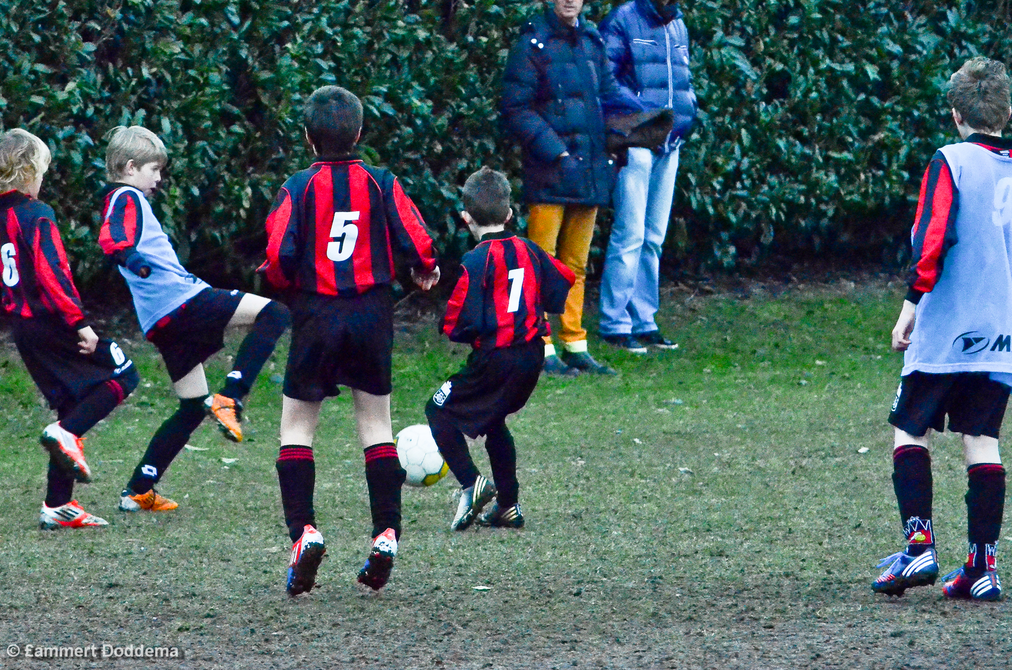 De F-pupillen rechtten hun rug en trokken ten strijde tegen E3. F1 was voetballend niets minder dan E3, zelfs beter in de combinatie. En ook fysiek bluften de jongelingen regelmatig de E-pupillen af en E3 was zeker niet de bovenliggende partij. Het grote verschil tussen E3 en F1 was de doeltreffendheid. Na 25 minuten strijd en voetbal stond het 2-0 (of was het 3-0?) voor E3.
