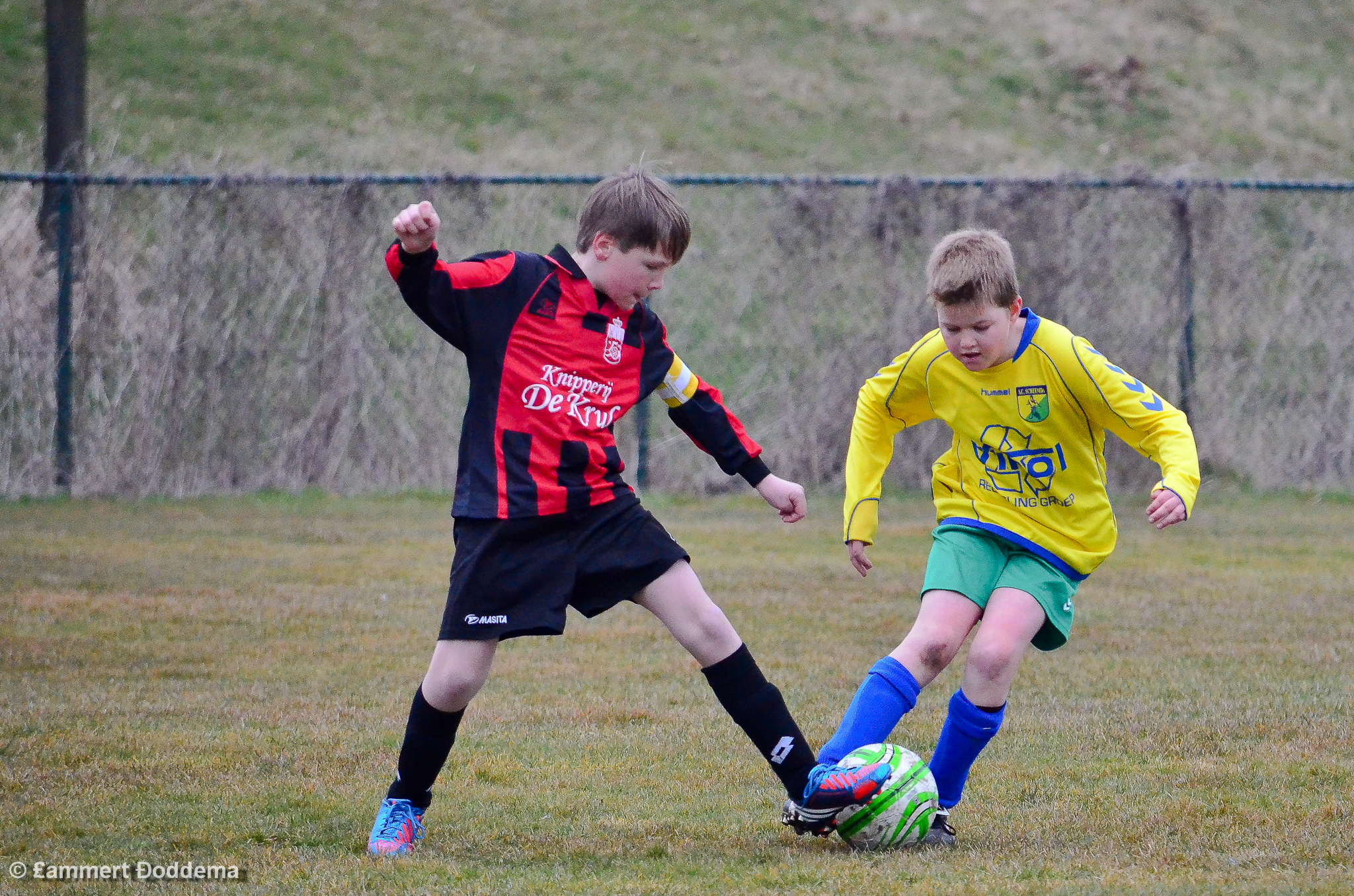Tom zet een speler van Sc Scheemda de voet dwars
